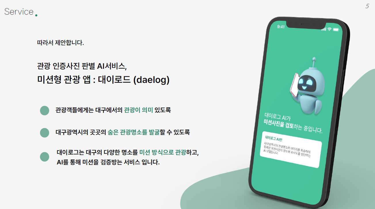 "관광 인증 사진 판별 AI 앱 - 대이로그"는 위 조건을 충족시켰다. 관광 인증 사진을 AI를 사용하여 검증하고 포인트를 줌으로써 많은 관광객들에게 대구의 관광지를 돌아다녀야 할 동기를 부여한다. 이는 수익을 추구하는 서비스가 아니라 관광 활성화를 위한 공공 서비스로서 기능할 것이다. 인증 사진을 검증하는 것은 하나의 미션으로 보고, "대구 관광 활성화", "AI 사진 검증", "공공 서비스" 라는 조건은 심플하면서 방향이 확실하다. 우리 팀은 주제를 2시간 만에 결정지은 후 바로 MVP 개발에 착수했다.