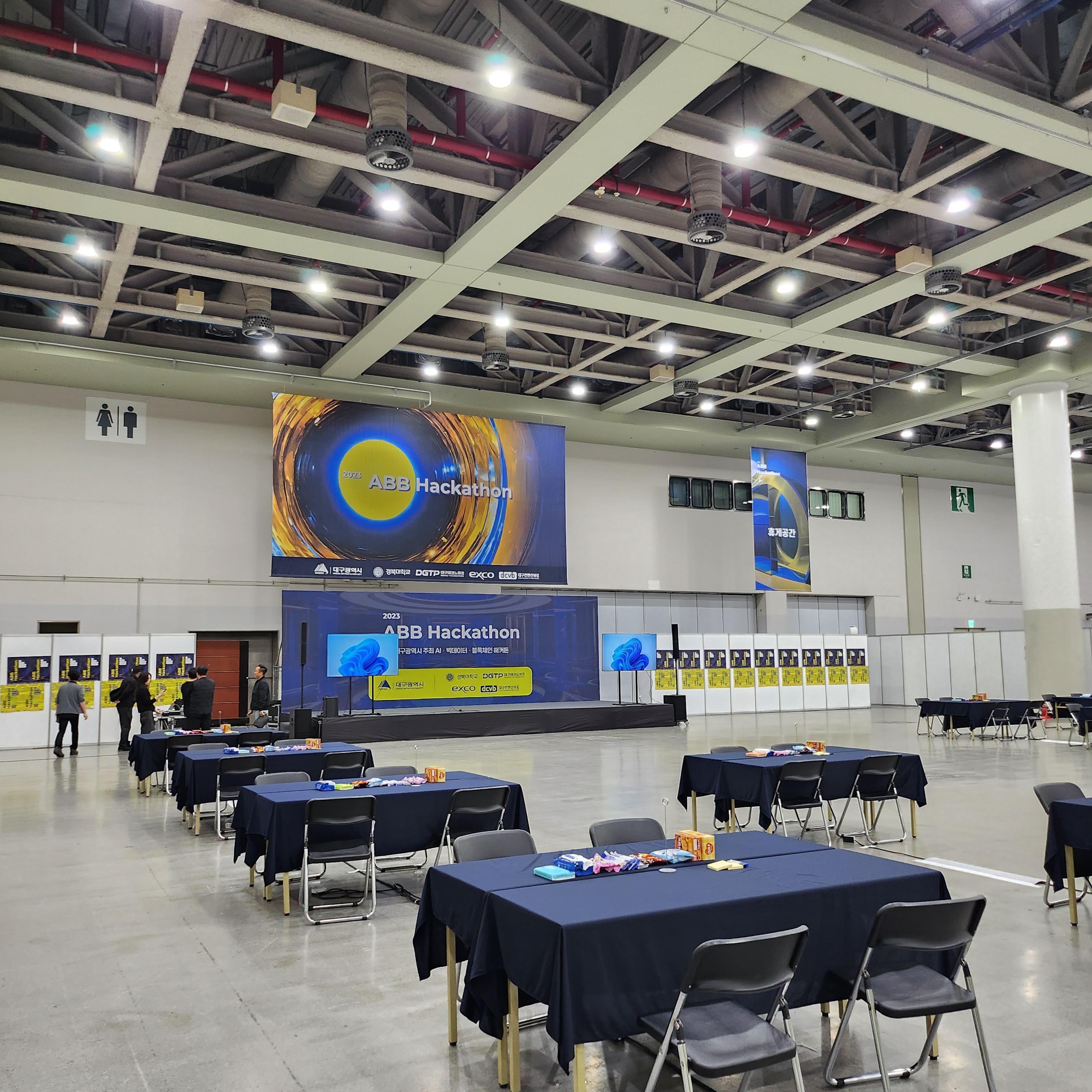 본선은 대구의 엑스코에서 개최되었다. 엑스코 서관 3홀을 통째로 빌려 테이블을 깔고 각종 다과와 굿즈를 나누어주었다. 벌써 6번째 참가하는 해커톤. 해커톤스러운 분위기가 반가웠다. 처음 보는 팀원들과 어색한 인사를 나누고.. 개막식을 통해 해커톤이 시작되었다.